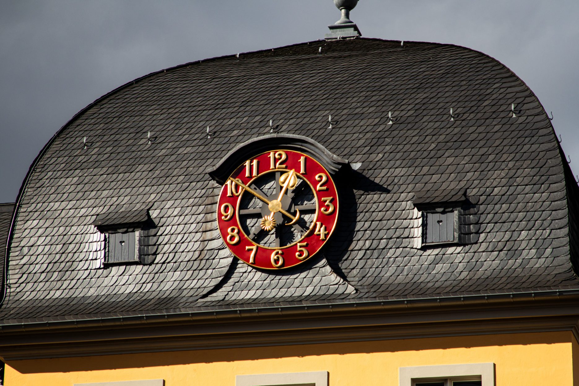 Eine große Uhr am Gebäude zeigt jedem Passanten auf einen Blick, wie spät es ist. Ist es früher oder später als erwartet?