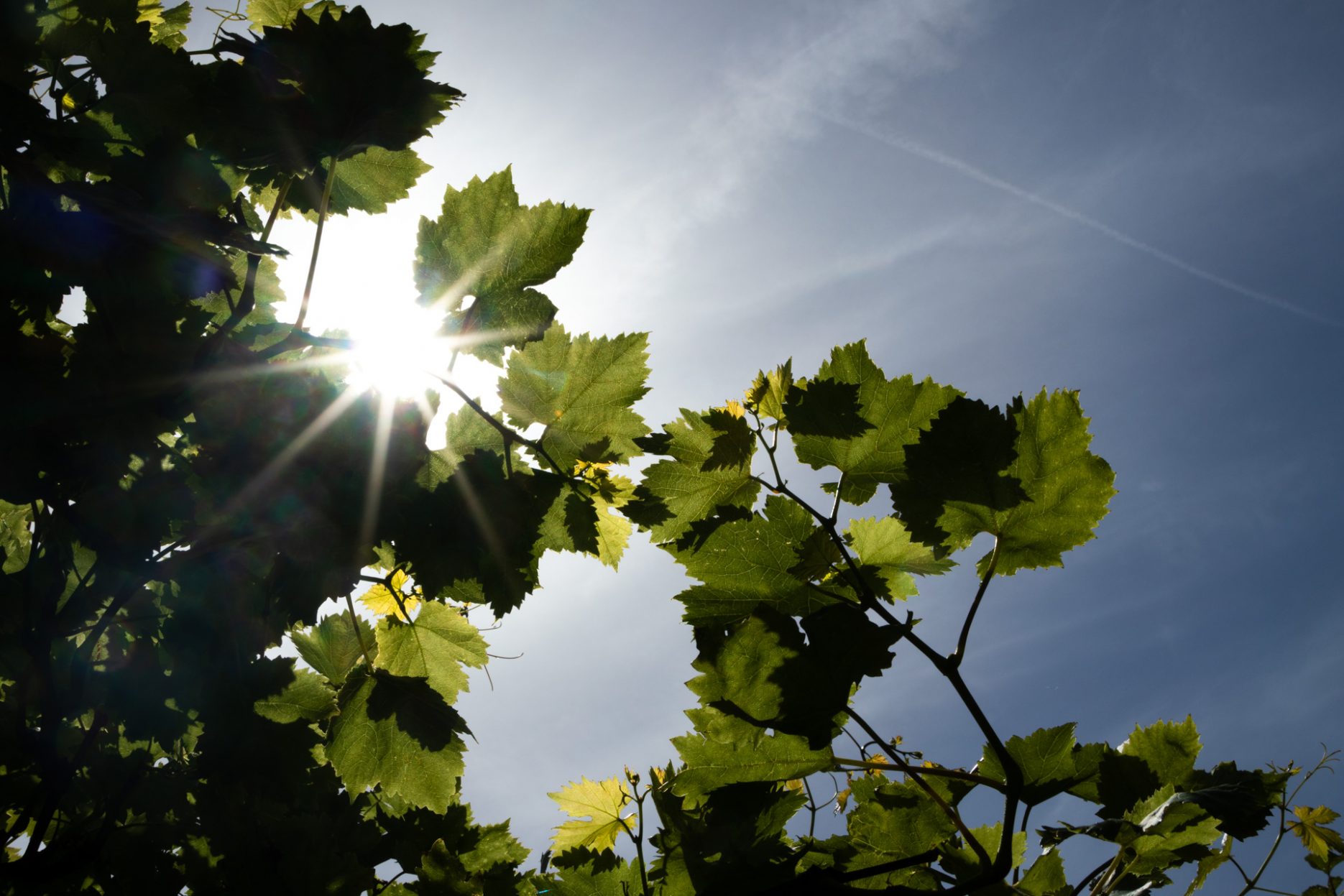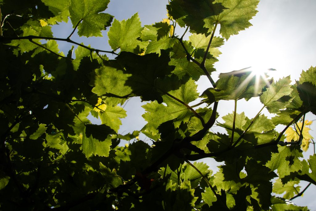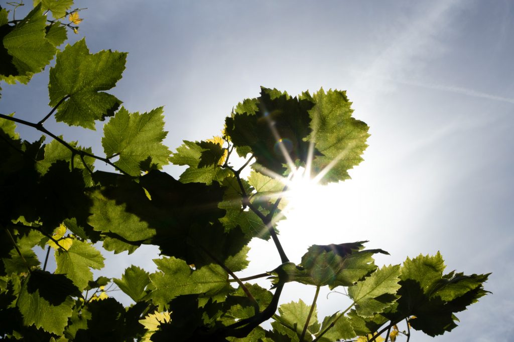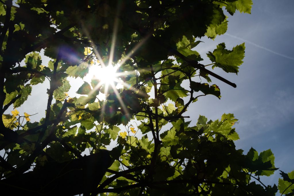 Der Himmel ist blau und nur von leichten Wolkenschleiern durchzogen. Die Sonne strahlt durch die Weinblätter und bringt so ein Gefühl von Urlaub im eigenen Garten.